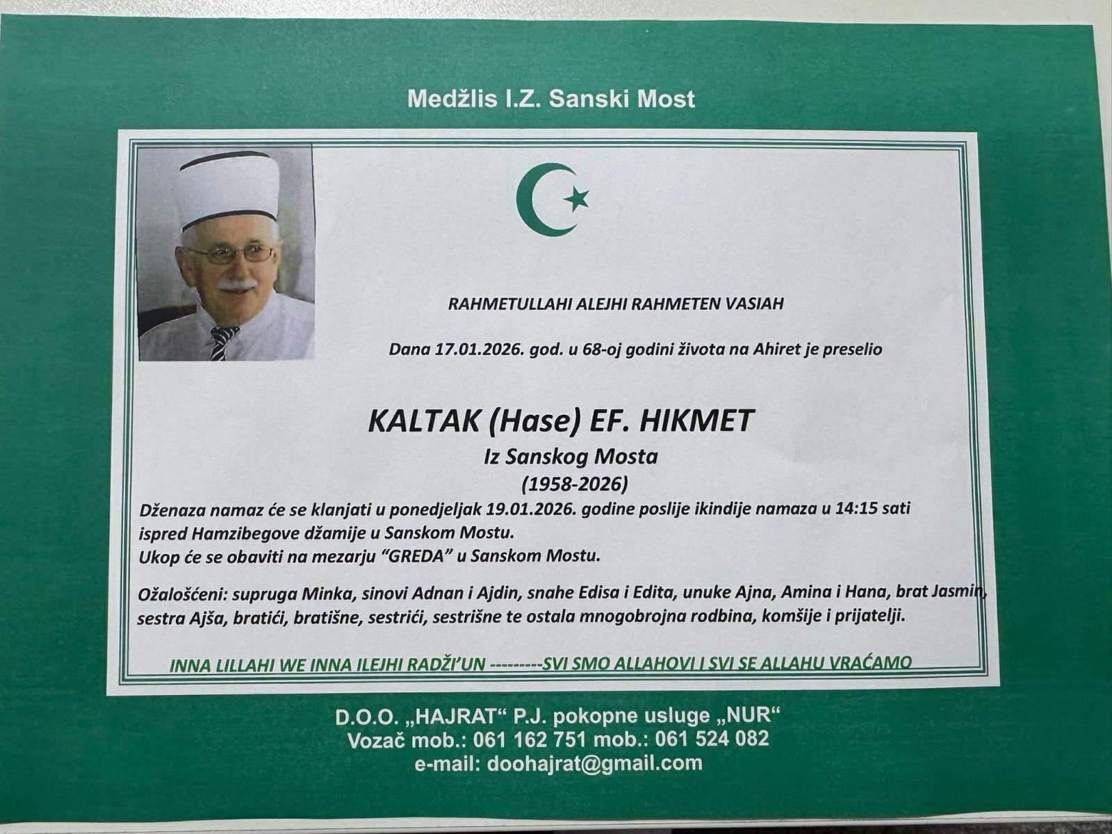 U svojoj 68. godini života, u subotu 17. januara 2026. godine, na ahiret je preselio penzionisani imam Odbora Udruženja ilmijje/Medžlisa IZ Sanski Most Hikmet-ef. Kaltak. On je bio dugogodišnji imam u više džemata Medžlisa IZ Sanski Most, a 30. septembra 2024. godine, u okviru Svečane akademije povodom obilježavanja Dana Udruženja ilmijje i 112. godišnjice rada i djelovanja ovog Udruženja, Hikmet-ef. Kaltak je dobio Priznanje za afirmiranje časnog imamskog poziva i doprinos radu Udruženja ilmijje IZ u BiH, čime je uz prigodne nagrade ispraćen u zasluženu penziju.