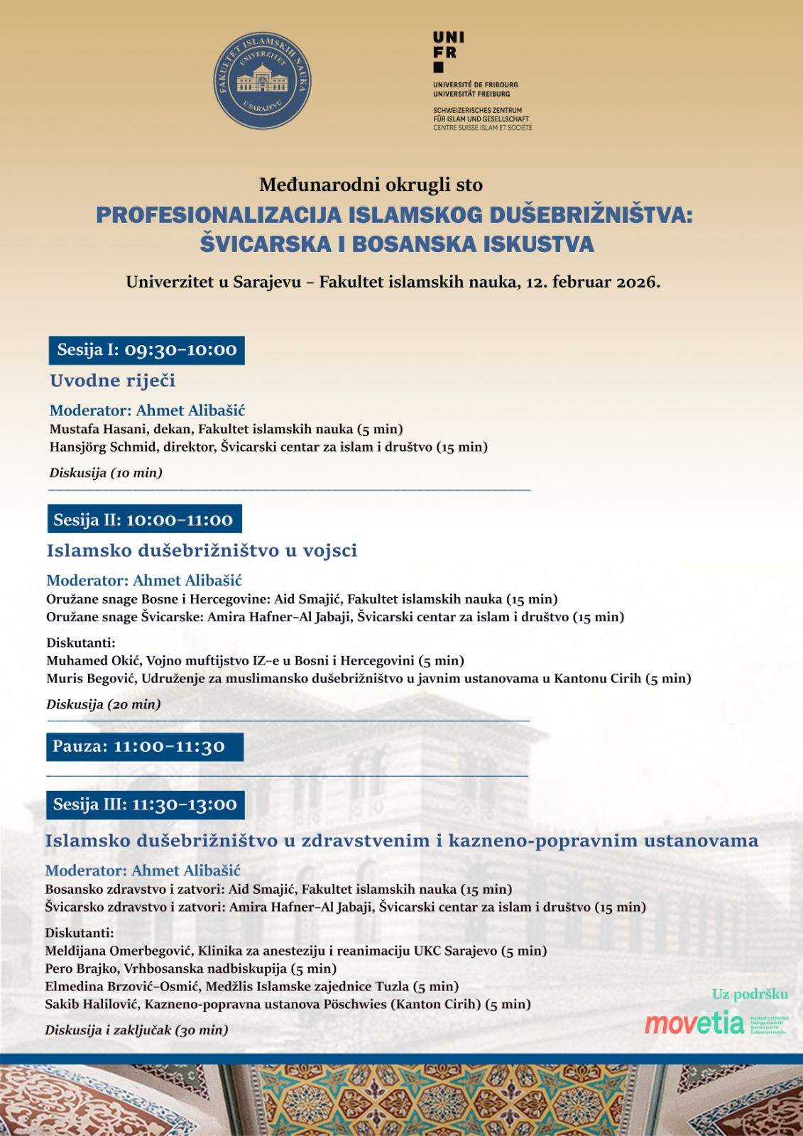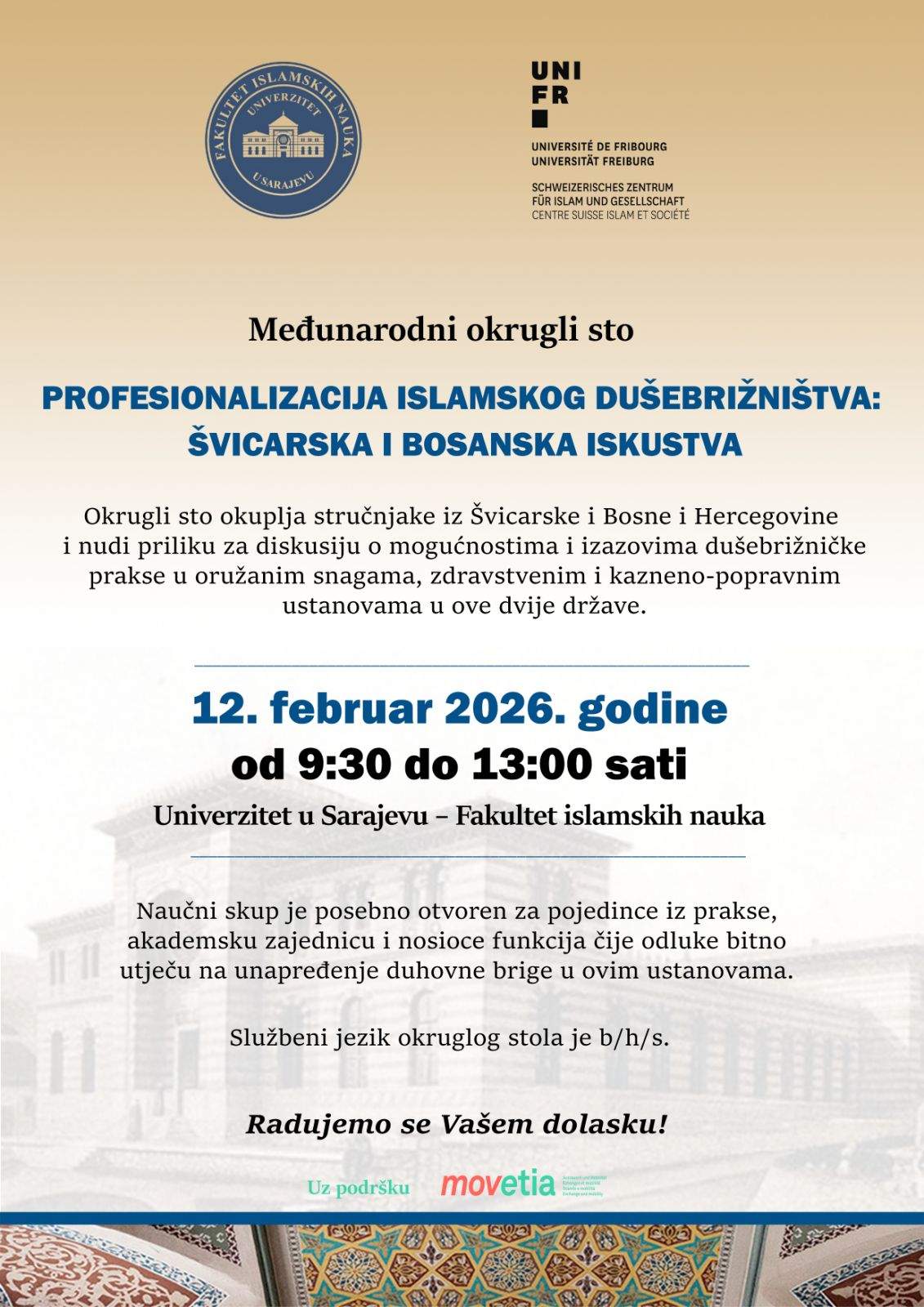 Na Fakultetu islamskih nauka Univerziteta u Sarajevu, u četvrtak, 12. februara 2026. godine, bit će održan međunarodni okrugli sto pod nazivom "Profesionalizacija islamskog dušebrižništva: švicarska i bosanska iskustva".