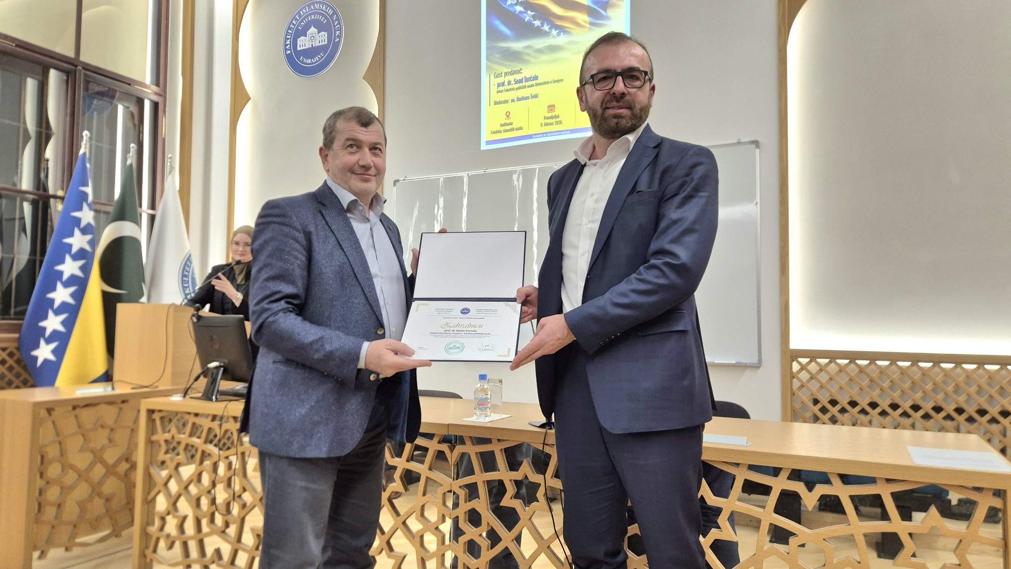 Na kraju tribine dekan Fakulteta islamskih nauka Univerziteta u Sarajevu dr. Mustafa Hasani uručio je prof. dr. Seadu Turčalu zahvalnicu za učešće.