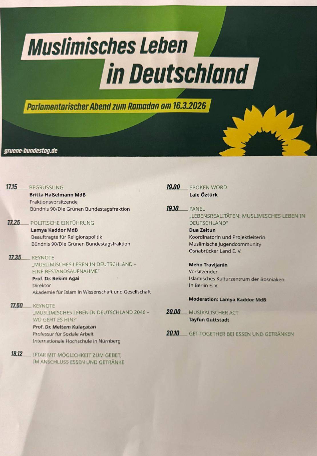 U zgradi njemačkog Bundestaga 16. marta 2026. godine održan je prvi zvanični iftar pod nazivom "Život muslimana u Njemačkoj – parlamentarno veče u ramazanu", čime je otvoreno novo poglavlje u institucionalnom prepoznavanju vjerske i kulturne raznolikosti Njemačke. Događaj je organizovan na inicijativu stranke Zelenih i njihove poslaničke grupe.