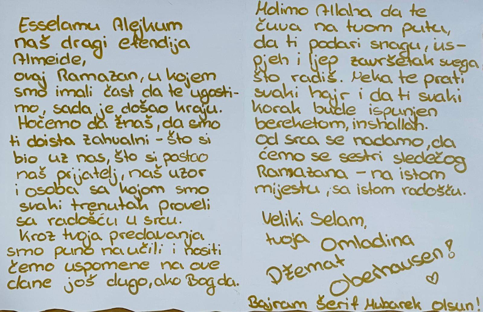 Naime, mladi iz džemata uputili su mu iskrene i tople pisane riječi u kojima ističu da im je bila čast i radost što je bio uz njih, naglašavajući da je postao njihov prijatelj s kojim su svaki trenutak provodili s radošću u srcu. Također su istakli kako su mnogo naučili kroz njegova predavanja tokom mjeseca ramazana.