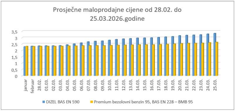 Prosječna cijena litre premium bezolovnog benzina 95 iznosi 2,64 KM, što je za tri feninga više nego jučer, dok je prosječna cijena litre dizela 3,34 KM, što je za 5 feninga više u odnosu na dan ranije.