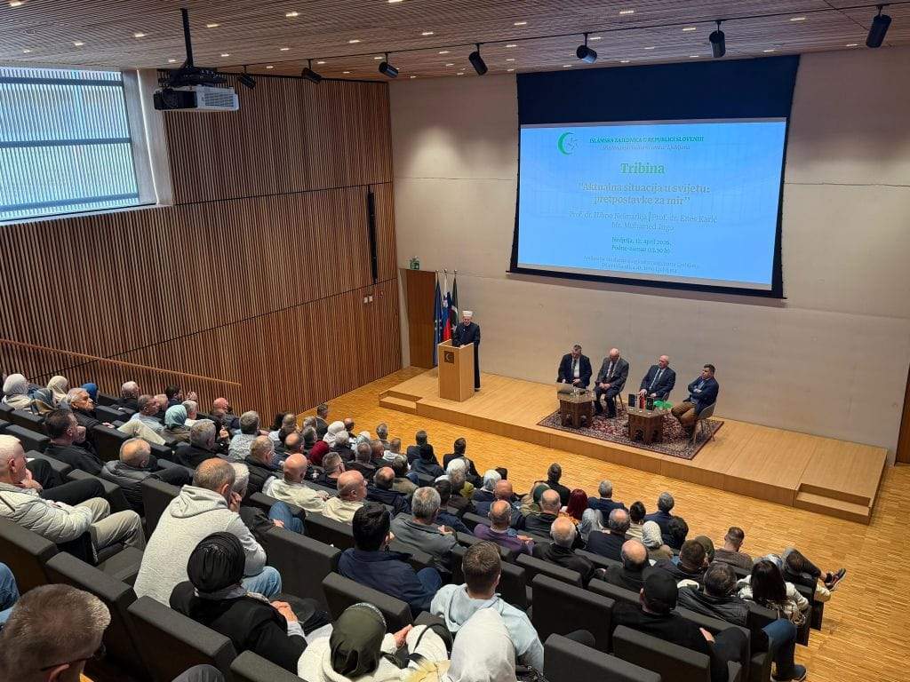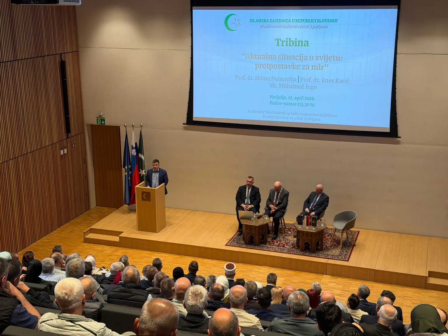 U nedjelju, 12. aprila 2026. godine, u Muslimanskom kulturnom centru Ljubljana održana je tribina o temi "Aktualna situacija u svijetu: pretpostavke za mir", koju je moderirao Nevres Mustafić.
