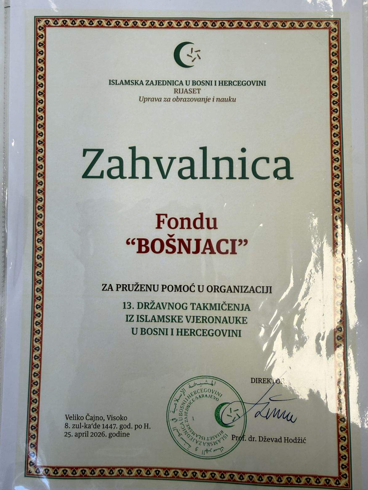 Na kraju takmičenja, u ime Uprave za obrazovanje i nauku dodijeljene su Zahvalnice Medresi „Osman-ef. Redžović“ na već tradicionalnoj podršci ovom najobimnijem i najznačajnijijem godišnjem projektu u domenu Vjeronauke, kao i Fondu „Bošnjaci“, koji već tradicionalno od početka podržava ovo takmičenje, kao i sve ostale projekte stipendiranja nadarenih učenika radi njihovog što uspješnijeg ličnog i profesionalnog razvoja.